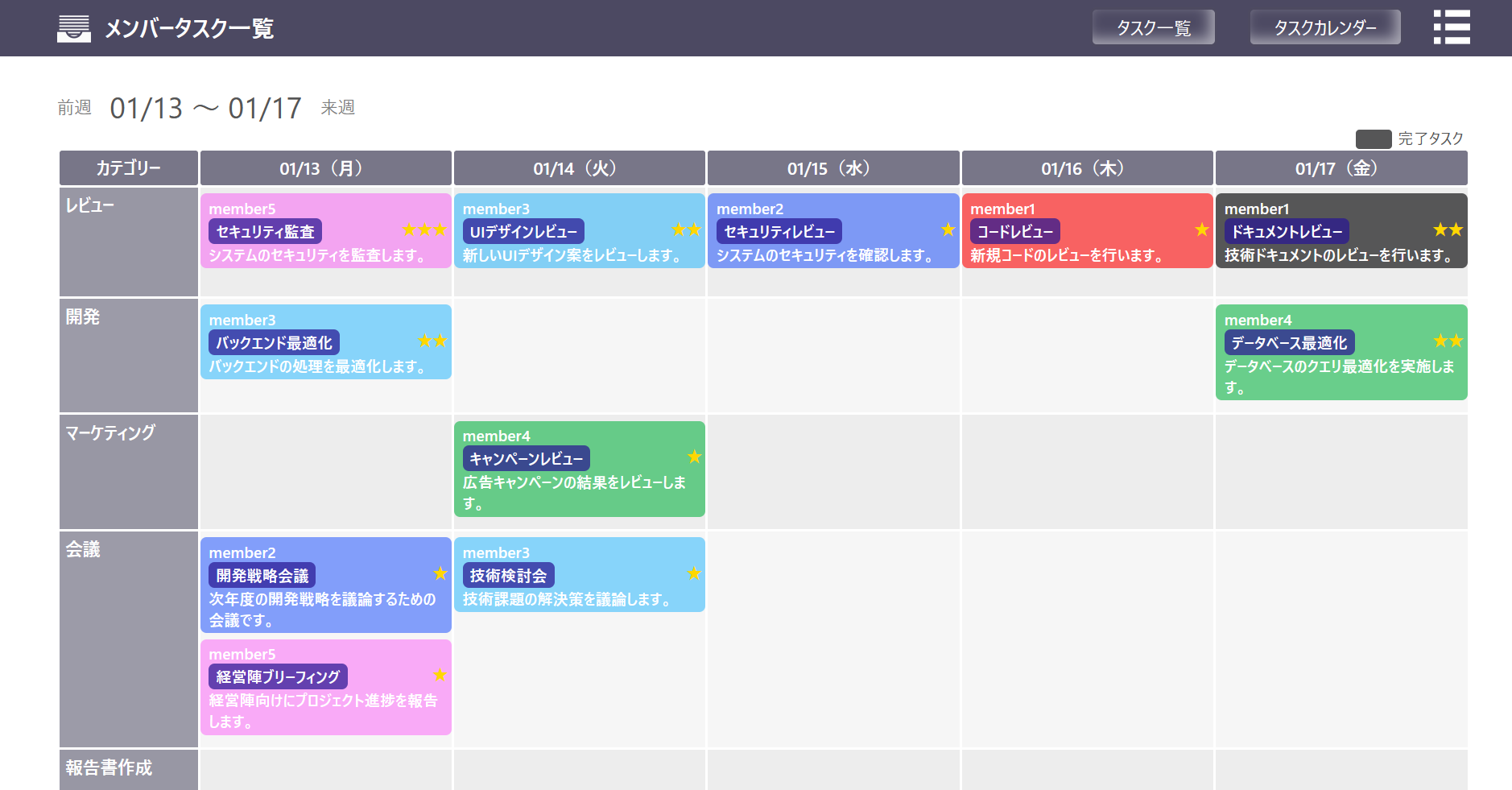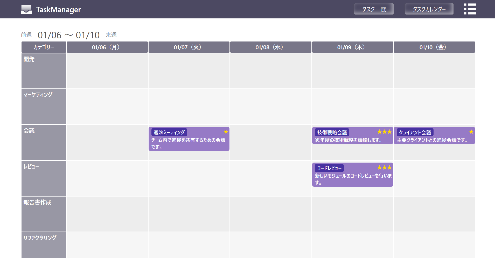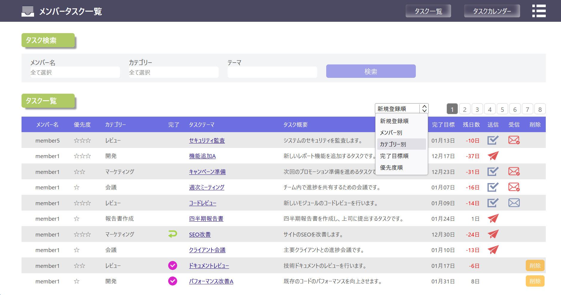 CRUD機能、検索、ページング、カレンダー表示に加え、アイコンでの